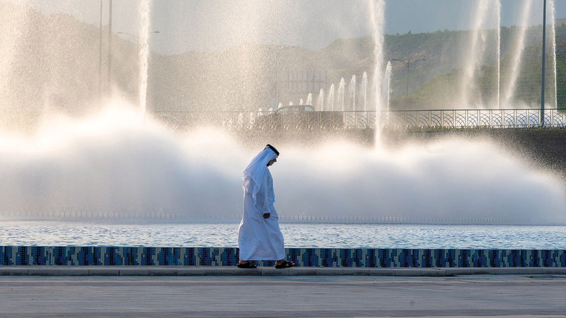 خطوات وئيدة بين الماء والخضرة والطبيعة البكر، حيث خورفكان التي تستريح بين البحر والجبل، وتتزين ميادينها بالنوافير والمناظر الخلابة والساحات الواسعة التي تعد استراحات للفرح، تجتذب الأفراد والعائلات من أهل المدينة وزوارها.