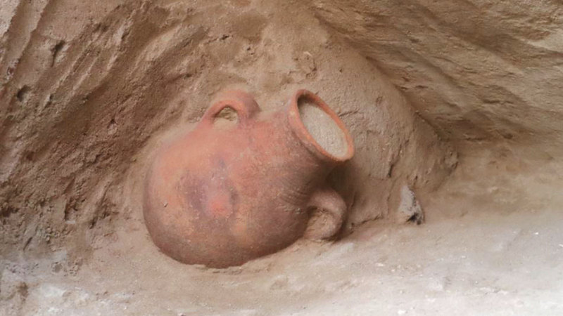 كشفت التنقيبات عن عدد من الأدوات المحفوظة جيداً بصورة استثنائية، منها جرة سليمة وغيرها من الخزفيات، والأوعية البرونزية، والأواني الزجاجية والمرمرية. من المصدر
