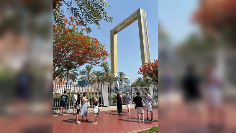 سياح يزينون ألبوم صورهم في محطة جمال لا تفوّت.. برواز دبي، الذي يتلألأ بلون الذهب ويزهو بتصميمه المتفرد، جاذباً ضيوف المدينة من كل الجهات.