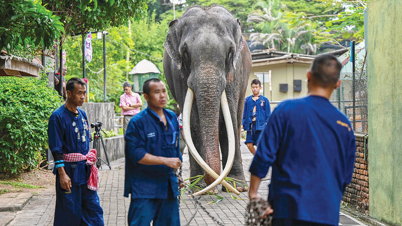 تايلانديون يدربون الفيل على الجلوس داخل قفص استعداداً لرحلته. أ.ف.ب