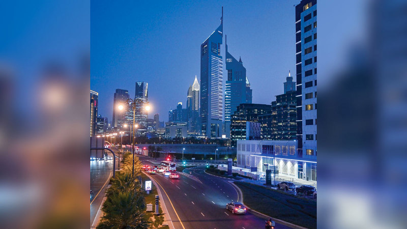 منظر لأفق دبي مع «أبراج الإمارات» أثناء غروب الشمس، كما يظهر من شارع السعادة في دبي.