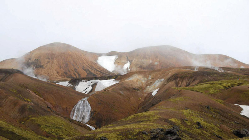 وفي المرحلة التالية من الجولة يمر مسار التجول وسط مناظر طبيعية بركانية تقطعها العديد من الأنهار الصغيرة، وكثيراً ما يتكسر الرماد البركاني أسفل أقدام السياح الذين ينعمون بتجربة تجول نادرة في أيسلندا.