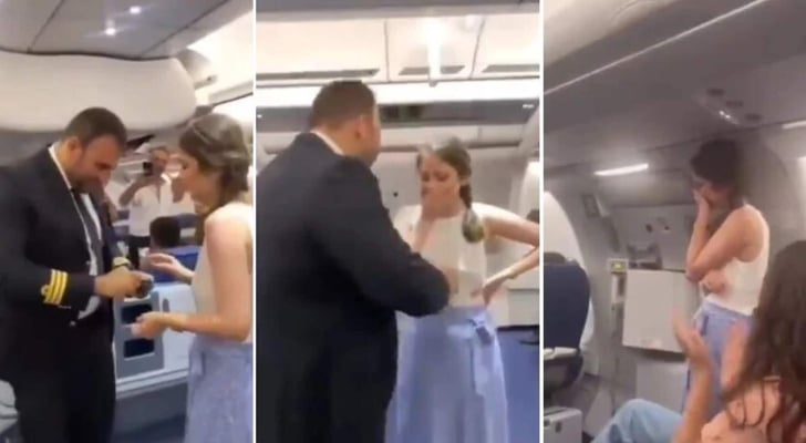 وفتح الكابتن مكبر الصوت ونادى برقم مقعد شابة جالسة بانتظار إقلاع الطائرة، متمنيا أن تكون زوجته، ثم طلب يدها لتكون شريطة حياته.