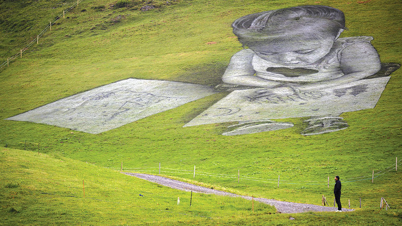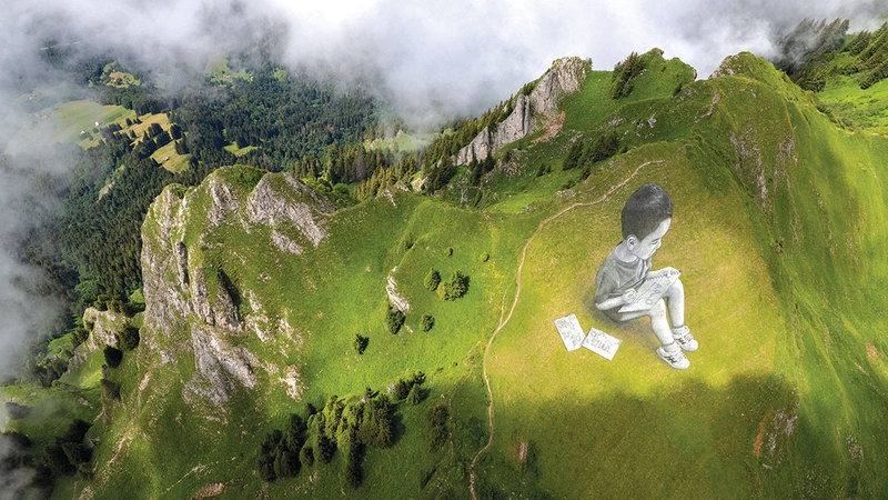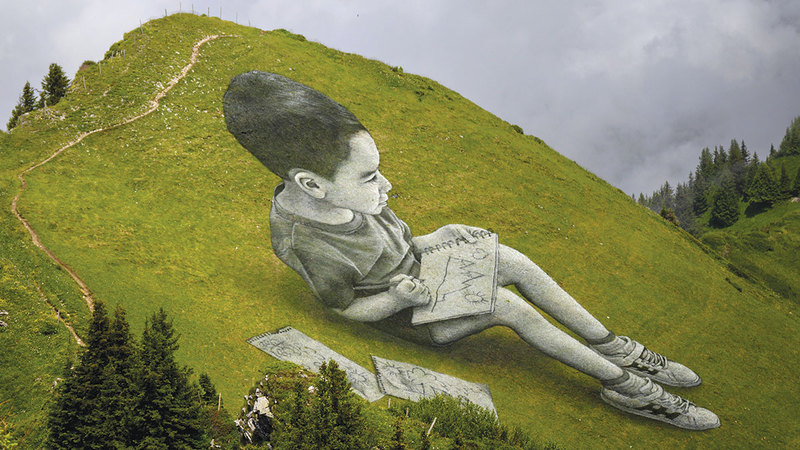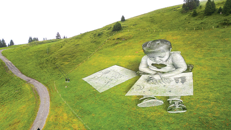 على المنحدرات الجبلية في قرية فيلار سور أولون السويسرية، استخدم فنان الطباشير والفحم لرسم لوحتين عملاقتين لطفلين يرسمان الطريقة التي يريان بها العالم الواسع من حولهما.