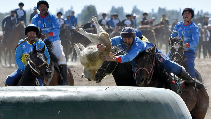 ويحاول أعضاء كل فريق الإمساك بمعزاة مذبوحة الرأس والإلقاء بها في وعاء خاص.