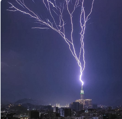 ولقي مقطع فيديو قصير، يوثق لحظة اصابة صاعقة برق على برج الساعة الشاهق في مكة المكرمة، لتُشكل شكل شجرة في السماء، تفاعلا كبيرا على مواقع التواصل الاجتماعي.