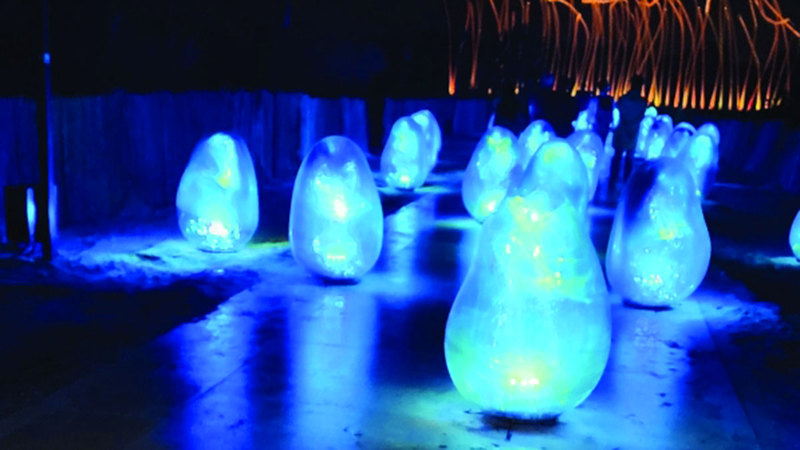 المزج بين الصوت والضوء كذلك، هو محور العمل الفني «صدى الحياة والأشجار» والذي يتكون من مجسمات مضيئة، تصدر نغمات فريدة عندما يلمسها الزوار، وتترافق النغمات مع الأضواء التي تنبعث من بين الأشجار المحيطة بالمكان، ليعكس تألق الضوء وارتفاع النغمات، وجود الأشخاص في المكان، بما يشبه احتفالاً بالحياة والناس، ويعبر عن التفاعل بين البيئة والإنسان. بعد ذلك يقود مسار الأعمال الفنية الزوار إلى الطريق المؤدية إلى جزيرة القرم عبر جسر خشبي يمتد لمسافة طويلة، وترتفع خلال السير أصوات الموسيقى وفقاً لسرعة السير. ومع نهاية الطريق، يقابل الجمهور العمل الفني «بين العوالم الدقيقة - الألوان الصلبة للضوء» والذي يتكون من أشكال بيضاوية، تصدر ألواناً مختلفة، وأصواتاً ذات إيقاعات عدة كلما دفعها الناس، ويختتم «تيم لاب» سلسلة أعماله الفنية بعمل «الأعمدة المتراقصة مع الرياح»، والذي يتكون من هياكل شفافة تتحرك في الهواء.