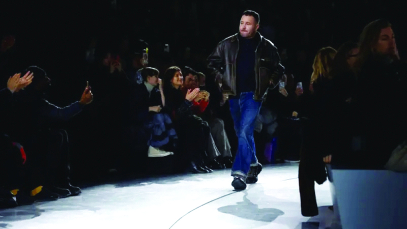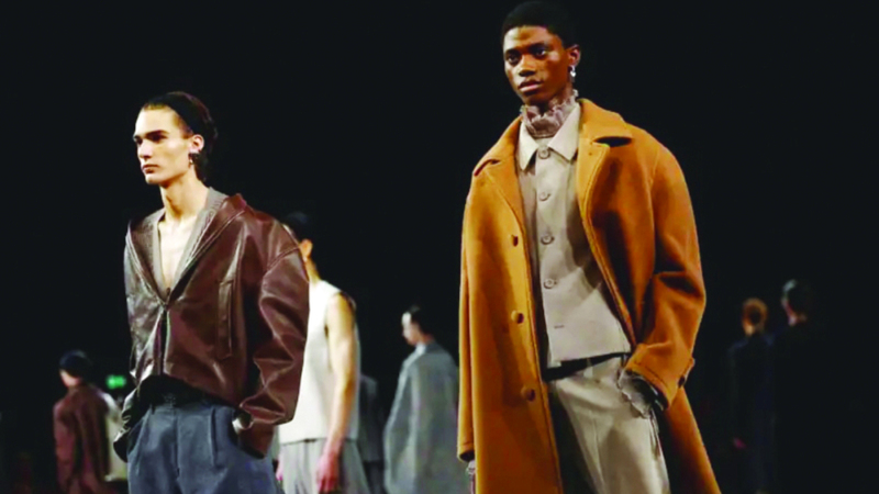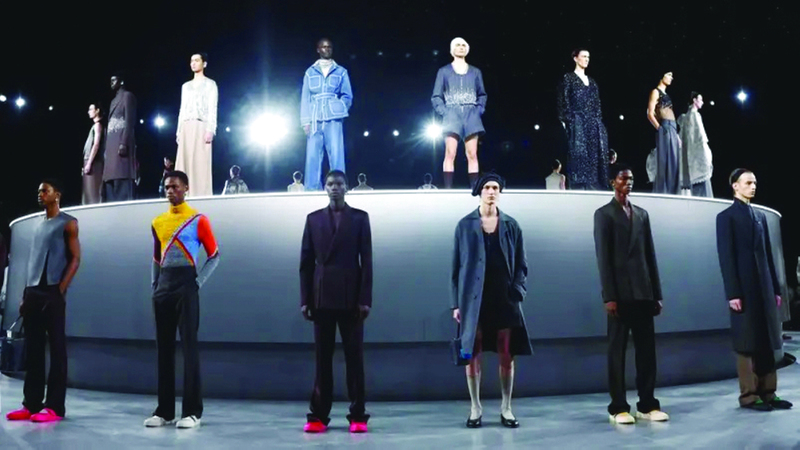وسار عارضو الأزياء حول منصّة دائرية بأحذية مسطحة تشبه أحذية راقصي الباليه، بينما كانوا يرتدون قمصاناً من دون ياقات، ومعاطف لامعة، ومجموعة من السراويل والسترات القماشية المشدودة عند الخصر والمرصّعة بأحجار «الراين».
