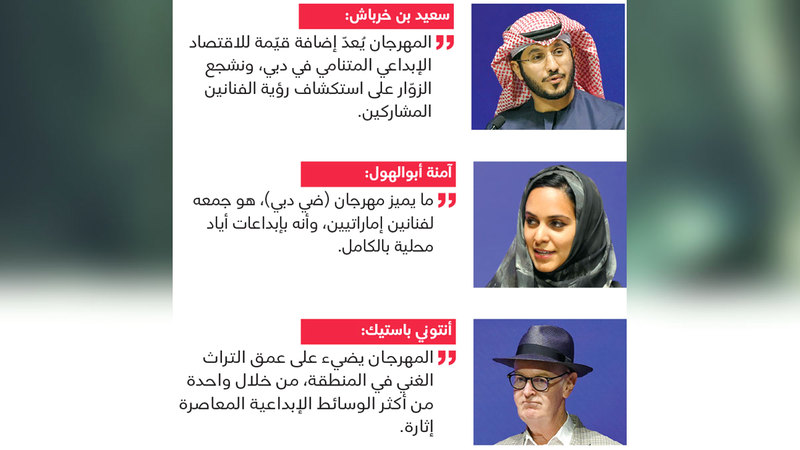 من جهته، قال الرئيس التنفيذي والمدير الإبداعي التنفيذي في «أي جي بي كرييتيف»، أنتوني باستيك، إن «مهرجان (ضي دبي) فرصة رائعة للتعمق في قصص أولئك الذين يعتبرون دولة الإمارات الرائعة وطنهم، إذ يعمل الفنانون والمصممون معاً على تسليط الضوء على جوانب مختلفة من الثقافة الإماراتية والعربية، معبّرين عن عمق التراث الثقافي والإبداعي الغني في المنطقة، من خلال واحدة من أكثر الوسائط الإبداعية المعاصرة إثارة».