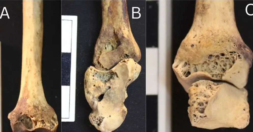 من جانبه، قال الدكتور عبد المنعم سعيد مدير عام آثار أسوان إنه بإجراء الدراسات على الهيكل المكتشف تبين تأثر عدد من المفاصل الموجودة على جانبي الجسم، بدءاً من اليدين والقدمين وصولاً إلى الكتفين والمرفقين والمعصمين والكاحلين.