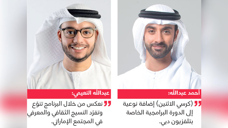 وقال مدير أول برامج تلفزيون دبي في «دبي للإعلام» أحمد عبدالله، إن إطلاق برنامج «كرسي الاثنين» يأتي في إطار عملية تطوير المحتوى الإعلامي، الذي تشهده «دبي للإعلام» عبر قنواتها ومنصاتها المختلفة، مشيراً إلى أن البرنامج يمثل إضافة نوعية إلى الدورة البرامجية الخاصة بـ«تلفزيون دبي».