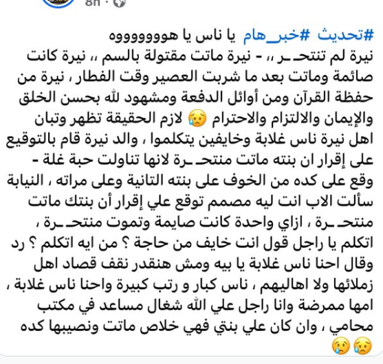وأشار الأب إلى أن ابنته كانت صائمة في يوم وفاتها، وأنها أصيبت بالتسمم بعد الإفطار.