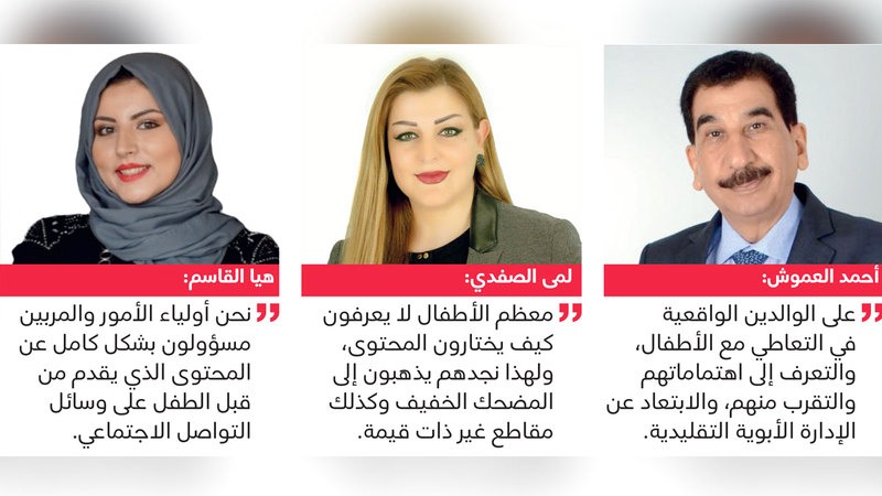 من ناحيتها، قالت الكاتبة في أدب الطفل ومدرب مهارات تفكير وميسر فلسفي للأطفال، هيا القاسم: إن «وسائل التواصل الاجتماعي باتت بمتناول الجميع، وضبطها ليس بالأمر السهل، ونشهد بروز حسابات تتحلى بالكثير من المتابعات وهي للأطفال، ونحن أولياء أمور ومربين مسؤولون بشكل كامل عن المحتوى الذي يقدم من قبل الطفل على منصات وسائل الاجتماعي، خصوصاً إن تم تجاوز القوانين التي لا تسمح بفتح حسابات دون سن محددة».