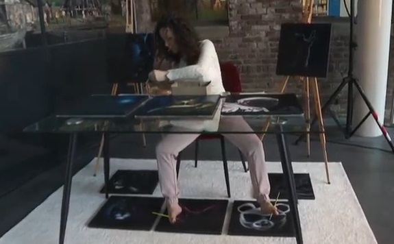 بفرشاتين بين أصابع قدميها وأخريين في يديها وملامح تركيز شديد ترتسم على محيّاها، ترسم الفنانة الهولندية راجاسينا فان دام (31 عاماً) عشر لوحات في وقت واحد في متحف مدينتها فلاردينغن، في خطوة انطلقت في الأساس من تحدّ بين أصدقاء.