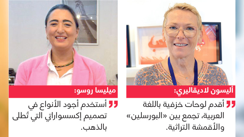 من جهتها، عملت الفنانة الفرنسية أليسون لاديقاليري، التي تعيش في دبي منذ 11 عاماً، على تقديم لوحات فنية من الخزف باللغة العربية، جمعت فيها بين «البورسلين» والأقمشة التراثية، مشيرة إلى أنها تنحت العمل، وبعدها تستخدم الأقمشة في صياغة اللوحات لتقديم كلمات تلامس الناس.