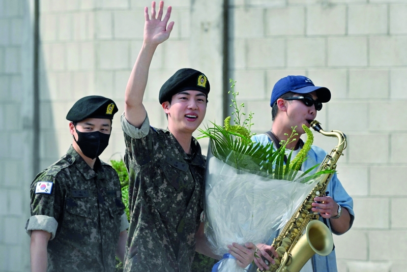 أنهى جين، أكبر أعضاء فرقة الكاي بوب «بي تي إس»، أمس، الخدمة العسكرية الإجبارية في كوريا الجنوبية، ما يتيح له استئناف نشاطه الموسيقي بشكل كامل.