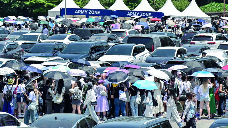 توافد عشرات آلاف الأشخاص من كوريا والعالم إلى سيؤول، أمس، للاحتفال بذكرى مرور 11 عاماً على انطلاق فرقة «بي تي إس» الكورية الجنوبية، غداة إنهاء أكبر أعضائها جين خدمته العسكرية.