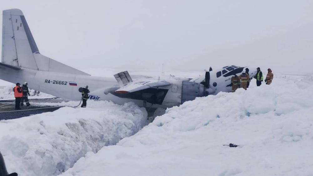 وكانت الطائرة من طراز «آن-26» في رحلة من مطار سابيتا إلى مطار أوتريني، عندما نفذت اليوم الجمعة هبوطاً في ظل تدهور حاد في الظروف الجوية التي اتسمت بضباب ورياح قوية، وفقاً لوكالة تاس للأنباء.