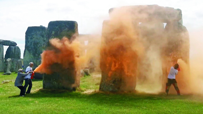 رش محتجون مدافعون عن البيئة طلاء على صخور ستونهنج الأثرية في بريطانيا، وأظهرت لقطات نشرت على الإنترنت طلاء برتقالياً يغطي بعض صخور البناء الصخري الشهير الذي يعود إلى عصر ما قبل التاريخ.