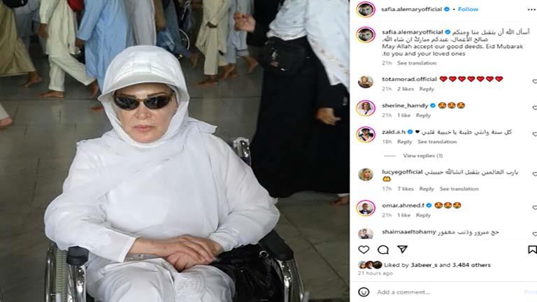 كما ظهرت الفنانة صفية العمري على كرسي متحرك أثناء تأديتها مناسك الحج عبْر حسابها الشخصي بموقع الصور والفيديوهات "إنستغرام"، وعلّقت قائلة: "أسأل الله أن يتقبل منا ومنكم صالح الأعمال، عيدكم مبارك إن شاء الله".