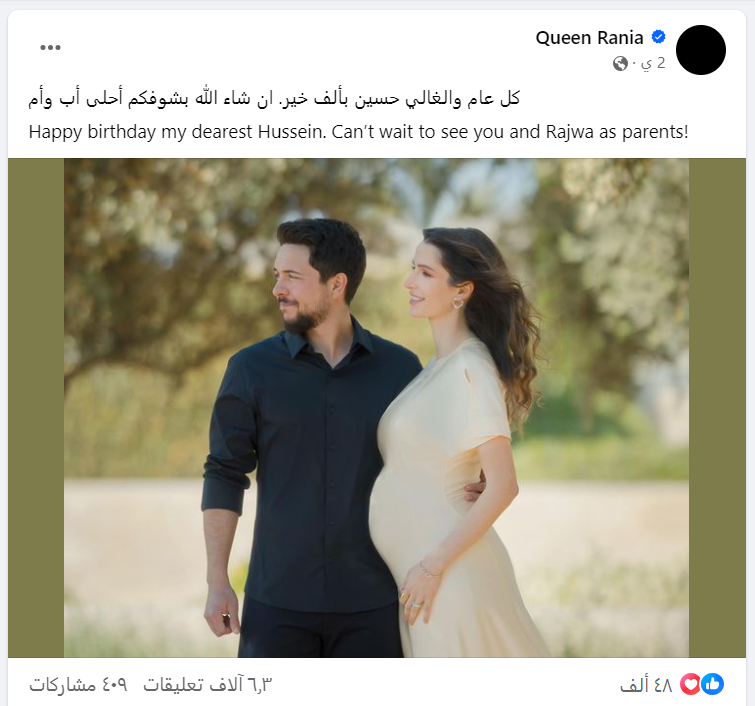 ونشرت الملكة عبر حسابها الشخصي على موقع «فيسبوك»، صورة جمعت بين ولى العهد وزوجته، كتبت عليها معلقة: «كل عام والغالي حسين بألف خير، إن شاء الله بشوفكم أحلى أب وأم».