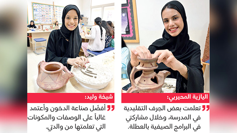 وقالت اليازية أحمد المحيربي (طالبة في الصف السابع في مدرسة الاتحاد)، إن التراث بكل عناصره يمثل جزءاً مهماً من الهوية الإماراتية، لذلك من الضروري التمسك به من قِبل الكبار والصغار في المجتمع، وتعليمه للأجيال الجديدة، مشيرة إلى أنها تعلمت بعض الحِرف التقليدية مثل صناعة الفخار والدخون والتلي في المدرسة، وأيضاً من خلال مشاركتها في البرامج الصيفية التي تنظم خلال العطلة، إذ يكون لديها وقت فراغ كبير يمكن استغلاله في تعلم أشياء جديدة، كاشفة أن صناعة الدخون هي المفضلة لديها.