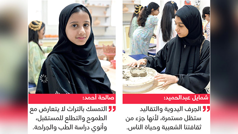 وعن علاقة الأجيال الجديدة بالتراث، ومدى إقبالهم على تعلمه، أكدت طالبات مواطنات لـ«الإمارات اليوم»، اعتزازهن بتراث الآباء والأجداد، وحرصهن على تعلم الحرف اليدوية، مشددات على ضرورة توظيف التقنيات الحديثة والمتطورة في تعليم التراث، بأسلوب أكثر جذباً حتى لا يتسلل الملل إلى المتدربات.