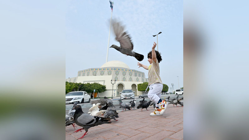لحظات براءة ولعب وسعادة ترفرف على كورنيش أبوظبي، وتحديداً في منطقة كاسر الأمواج، إذ يستمتع الصبي باللهو، ويقفز كأنه سيحلّق بجناحين في الهواء، وسيطير برفقة أصدقائه الجدد، الكائنات الوادعة التي تأخذ استراحة في هذا المكان الجميل، ليرسم الحمام، رمز السلام، مشهداً بكل الألوان، على الأرض وفي السماء، بين جنبات عاصمة إمارات الخير والمحبة والتعايش.