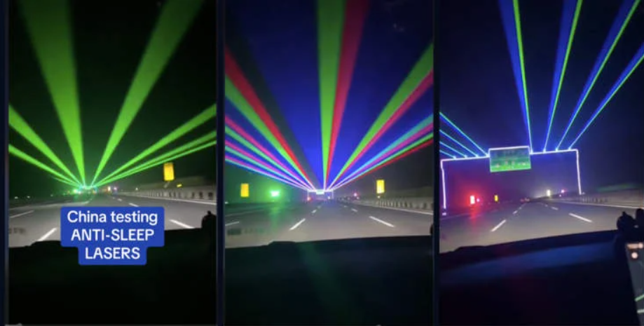 وفي العام الماضي، بدأت مقاطع فيديو لأشعة ضوئية ملونة يتم عرضها من لافتات الطرق السريعة في الصين تنتشر على وسائل التواصل الاجتماعي، مما جعل الناس تتساءل حول الغرض منها. وتبين أن ما يبدو وكأنه عرض ضوئي في حفل موسيقي في الهواء الطلق هو في الواقع طريقة تجريبية لمنع السائقين، وخاصة سائقي الشاحنات، من النوم أثناء القيادة. وتم تصوير المقطع الأكثر شعبية للتجربة الغريبة على طريق تشينغداو-ينتشوان السريع الذي يبلغ طوله 1600 كيلومتر، والذي يُقال إنه يستخدم بشكل أساسي من قبل الشاحنات الثقيلة من عاصمة نينغشيا التي تسافر إلى مدينة تشينغداو الساحلية. ونقل موقع "أوديتي" عن الشخص الذي قام بالتقاط الفيديو أن هذه الأضواء الليزرية المصممة لمكافحة التعب أعادت تنشيطه بسرعة وقللت من إرهاقه أثناء الليل المطول"، كما جاء في منشور على منصة X .