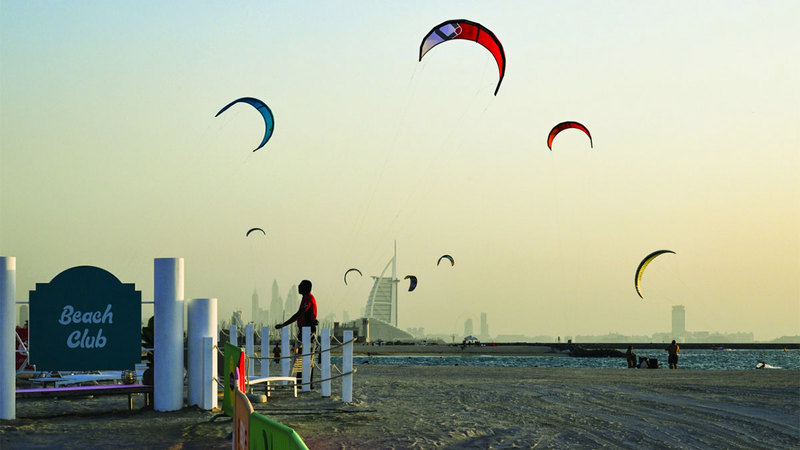 زوار على شاطىء «كيت بيتش» في دبي يلعبون الكرة على حواف الماء في وقت الغروب، حيث تنخفض درجات الحرارة مساء، ويصير الجو مناسباً للهو والنزهات، وقضاء أوقات ممتعة مع العائلة والأصدقاء في وجهات دبي السياحية والعائلية، وعلى شواطىء المدينة الساحرة.