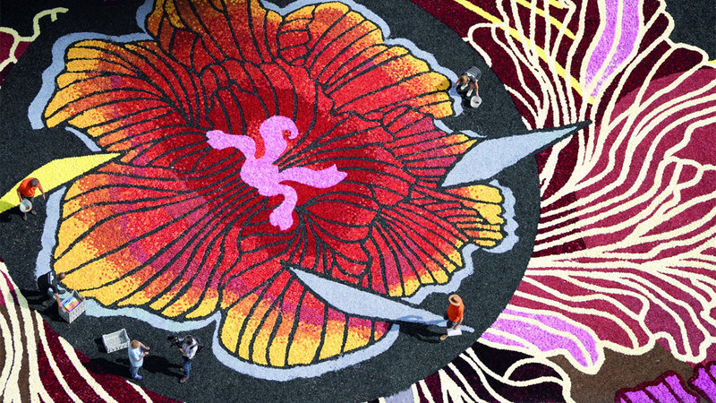 كما تم استخدام الحشائش وورق الشجر لتلوين هذه السجادة العملاقة، ولم يتم استخدام تربة لتثبيت الزهور بل تم وضعها على أرضية الساحة مباشرة.