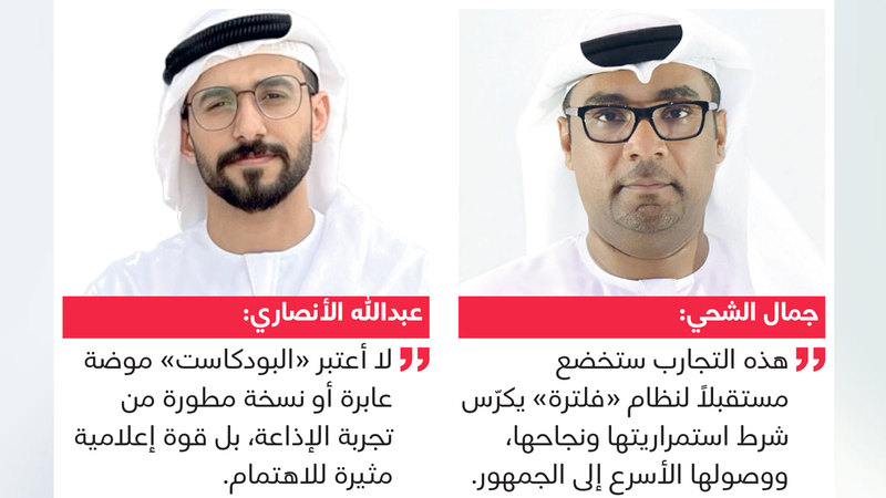 من جهته اعتبر الكاتب الإماراتي، جمال الشحي، أن «البودكاست» هو «ترند» العصر الأكثر حضوراً على وسائل التواصل الاجتماعي، لسهولة تقديمه سواء على صعيد المضمون أوالإنتاج الذي ينأى بنفسه عن وسائل الإعلام التقليدية، موضحاً: «يجب الانتباه دائماً إلى شروط النجاح التي يجب أن تتوافر في (البودكاست) وتتعلق قبل كل شيء بالمحتوى الجديد المقدّم للمستمعين، والبعد المعرفي الأساسي للمقدم والضيف، وعدم انحصار التجربة فقط في تقديم الأسئلة، وإنما في تقديم المعلومة الصحيحة لمختلف شرائح الجمهور، بمستوياتها العمرية والمعرفية المختلفة»، مضيفاً: «أما تجربة (البودكاست) الإماراتي فتبدو لي أكثر تنظيماً على الرغم من أنها بدأت متأخرة، مقارنة بالدول العربية، لكنها ستكون أكثر حضوراً وتنظيماً في ظل إيجاد جهات داعمة، سواء كانت حكومية أو خاصة، إلى جانب مبادرات فردية أثبتت مع الوقت حضورها على الساحة الإعلامية لتصبح جديرة بالمتابعة، لهذا السبب يمكن اعتبار (البودكاست) الوسيلة الإعلامية الجديدة التي ستفتح آفاق الإعلام الرقمي مستقبلاً».