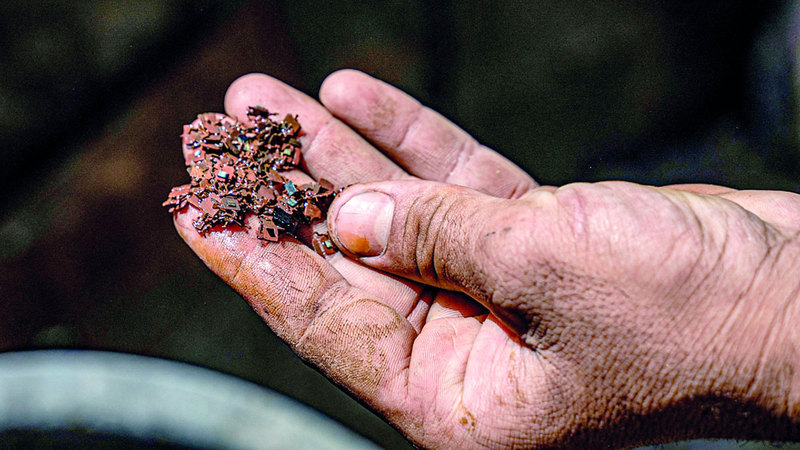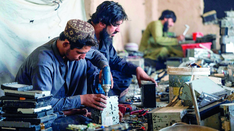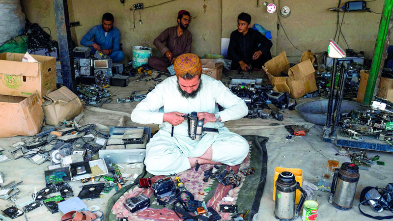 يعمل عدد من الأفغان وهم قاعدون أرضاً في ورشة عمل متهالكة بمدينة سبين بولداك على الحدود مع باكستان على إعادة تدوير الذهب من النفايات الإلكترونية المتأتية من بلدان غنية، وهو نشاط مربح لكن بالتأكيد لا مستقبل له.