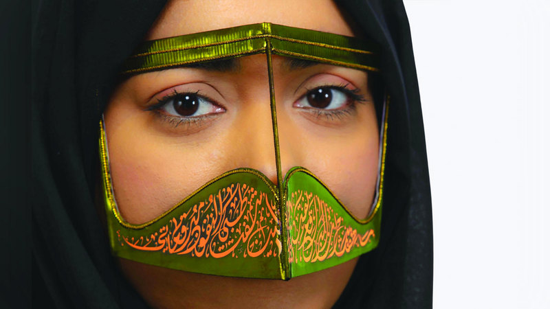 • «الشماغ» أعيد تصميمه على هيئة «ربطة عنق» و«البرقع» بلمسات عصرية تتخللها أبيات شعرية يتغزل فيها قائلها بجمال مرتديته.