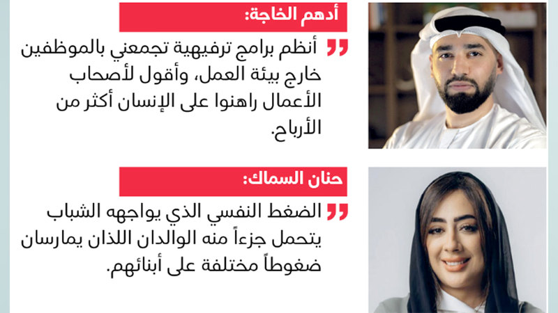 واستناداً إلى تجربة إدارته لمجموعة من «رأس المال البشري» في بيئة الأعمال التي يديرها، قال الإماراتي أدهم الخاجة، إن «الصحة النفسية قد تكون أحياناً أهم من الصحة الجسدية، لأنه إذا تعطلت الروح تعطل العقل وغابت القرارات الصائبة، وبات النجاح حلماً بعيد المنال»، مشيراً إلى انكبابه على مبادرات وشراكات مع مختصين لرفع معنويات موظفيه، ودعم صحتهم النفسية التي يراهن عليها لرفع إنتاجيتهم وتحقيق الرضا المهني. وتابع الخاجة: «بعد أزمة الجائحة، ظهرت تداعيات نفسية بالجملة على الناس حول العالم، لذا أتجه حالياً في العمل إلى كسر حواجز التراتبية، ومحاولة الإصغاء إلى حاجيات الموظفين لملامسة أهدافهم وأحلامهم المهنية، وتنظيم برامج ترفيهية ورياضية تجمعنا خارج بيئة العمل، ولا أخفي أنني بدأت أتلمس أثرها الرائع في نفسيات الجميع هنا»، موجهاً أصحاب الأعمال إلى المراهنة على الإنسان أكثر من الأرباح.