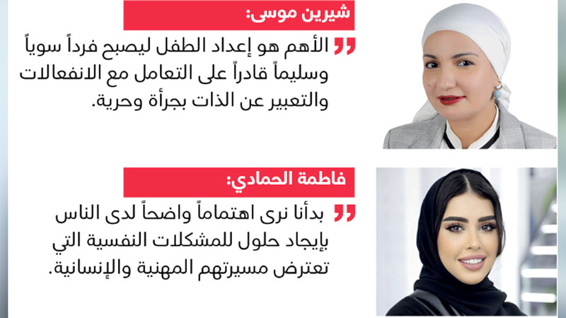 من جهتها، توقفت فاطمة الحمادي المدربة الإماراتية المعتمدة ومؤسسة تجربة «تفكر» للاستشارات النفسية، عند أهمية الاهتمام بالصحة النفسية للأفراد، مشيرة إلى الدراسة التي أجرتها أخيراً حول هذا الموضوع. وقالت: «هناك تطور واضح في وعي أغلبية الأفراد على مستوى الدولة بخوض التجربة، وأنا هنا أتحدث عن المواطنين والعرب، من مستويات عمرية متعددة، الذين وجدوا طريقهم إلى عالم الصحة النفسية، في الوقت الذي بدأنا فيه نلاحظ - على نطاق أوسع - حرص كبريات الشركات والمؤسسات العامة على تأهيل القادة وإعداد الموظفين من الناحية النفسية، لتحقيق أهداف النجاح والتميز»، مضيفة: «يمكننا القول إن نسب زيادة الاهتمام واضحة وتصل إلى نحو 80%، مقارنة بالسنوات المنصرمة، وهذا مؤشر جيد يؤكد حرص الأفراد في مجتمع الإمارات على ضرورة إيجاد حلول للمشكلات النفسية التي تعترض مسيرتهم المهنية والإنسانية، على الرغم من أن أغلبية هذه المشكلات تنحصر في إطار مشكلات الأزواج والارتباط الأسري لدى الفتيات، وفي علاقة الآباء بالأبناء، وطرق التعامل القاسي معهم، وكذلك أعباء المسؤوليات الزائدة لدى البعض».