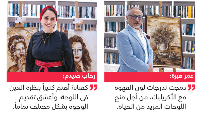 فيما شاركت الفنانة الأردنية رحاب صيدم، بلوحات أبرزت من خلالها جماليات الوجوه النسائية بالقهوة ومزيج من الأكريليك ومواد أخرى، معتمدة على تقنية الكولاج في اللوحات، إذ مزجت اللون مع أشياء متنوعة، مشيرة إلى أنها كفنانة تهتم كثيراً بنظرة العين في اللوحة، وتعشق تقديم الوجوه بشكل مختلف تماماً.