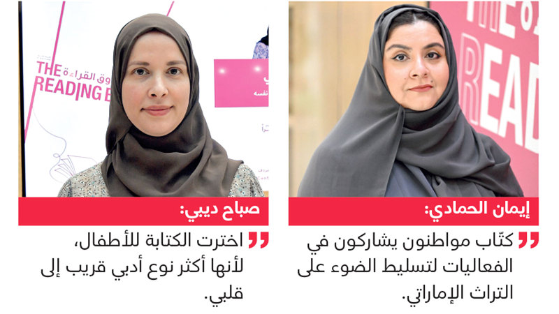 ونوهت إيمان الحمادي بمشاركة كتّاب مواطنين سيسلطون الضوء على التراث الإماراتي، من بينهم نادية النجار التي تقدم قصة حول التلي، ونورا الخوري التي تعرض قصة عن كنوز الغاف، بجانب مشاركات متنوعة، ومنها ما سيقدم باللغة الإنجليزية.