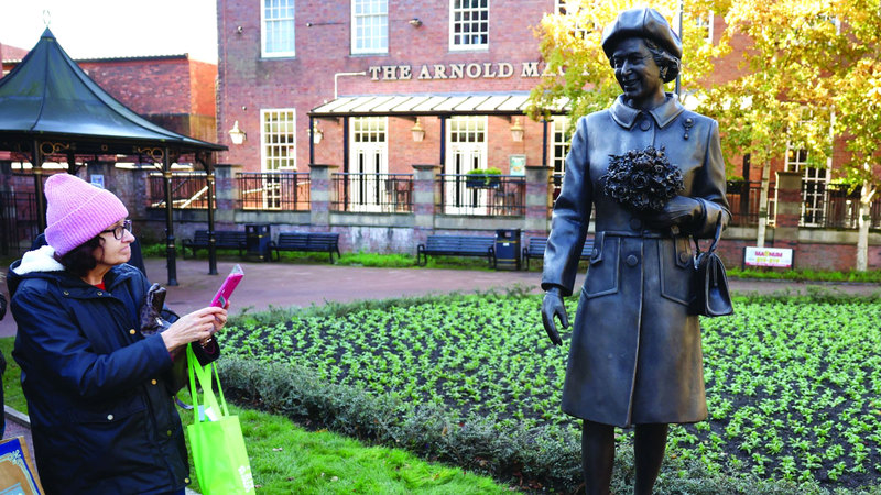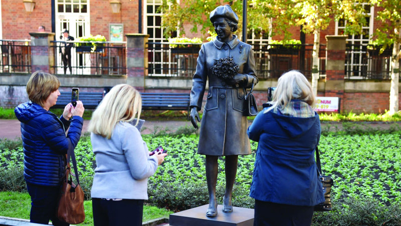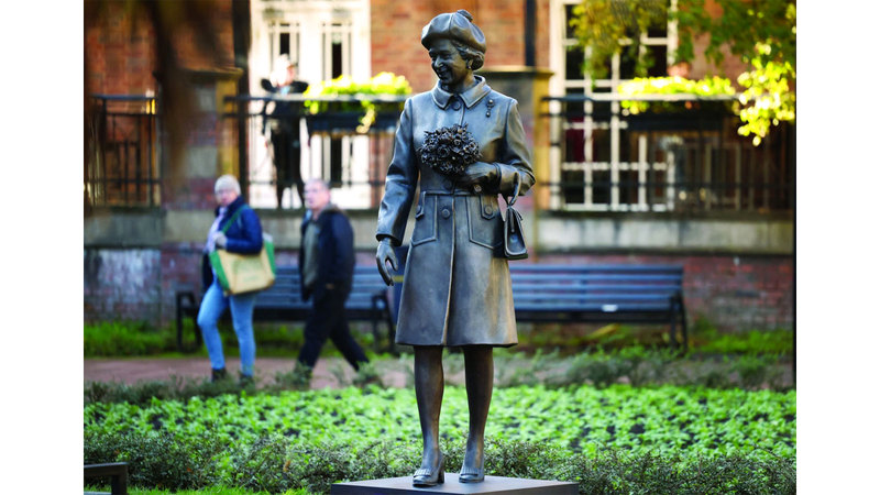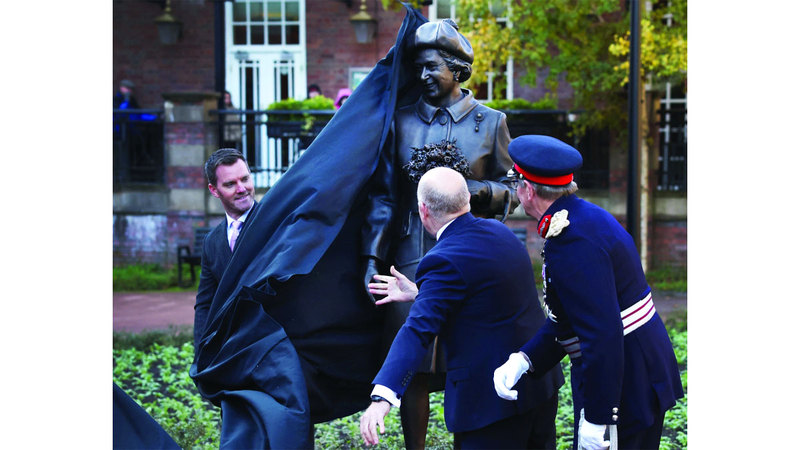 أزاح عدد من كبار المسؤولين المحليين الستار أمس، عن تمثال جديد للملكة البريطانية الراحلة إليزابيث الثانية من تصميم الفنان آندي إدواردز في مدينة نيوكاسل أندر لايم، في بريطانيا. في الوقت الذي توافد مئات الزوار والسياح من محبي الملكة الراحلة لالتقاط الصور التذكارية أمام التمثال.