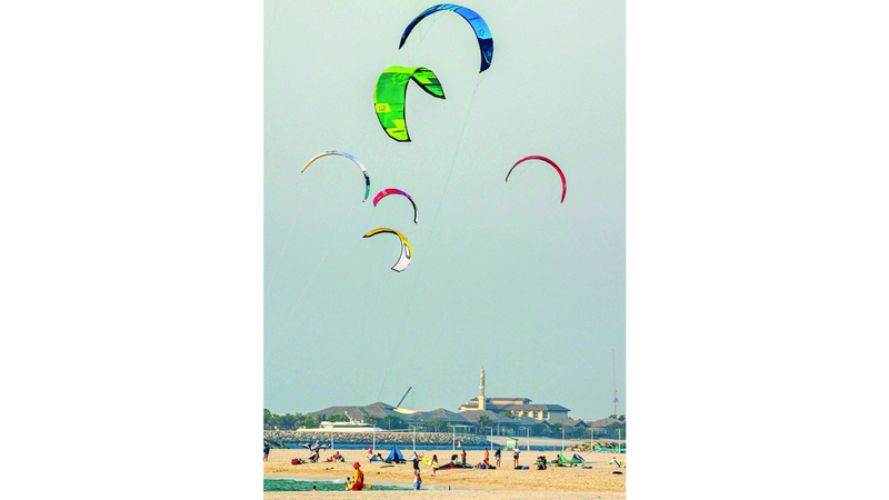 أجواء ممتعة، رملاً وبحراً وجواً، حيث يتزيّن شاطئ جميرا، بعشاق الأمواج ومحبي ترويضها، الذين يمارسون رياضتهم المفضلة، التي تحتاج إلى قدرات خاصة وتدريب طويل، بأعداد كبيرة على إحدى أكثر الوجهات البحرية الشهيرة في دبي، ويجمّلون سماء المكان بألواحهم، وكذلك مظلاتهم وأشرعتهم الزاهية، التي تبدو كما الطيور العملاقة، التي تطارد الريح، وتحلّق في كل الاتجاهات، وتتمنى ألّا تخذل صاحبها الذي يستمتع بين مياه الخليج الصافية، وتيارات هذا الأزرق الشاسع.. البحر.