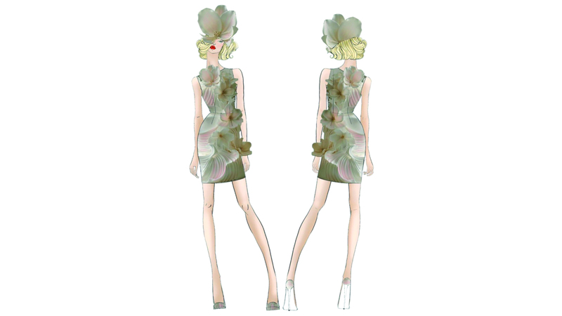 أبرز ما ميز التصميم هو الزهور الكثيرة التي تغطي الفستان من الأمام والخلف، إضافة إلى الزهرة الكبيرة على الرأس.