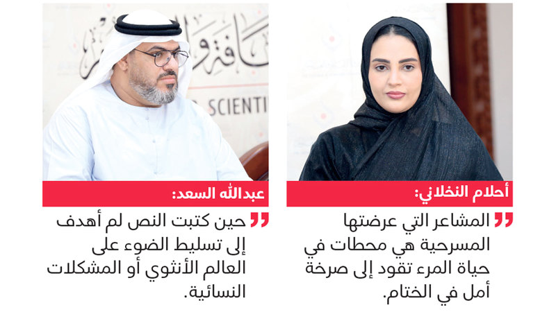 ولم يتعمد مؤلف المسرحية عبدالله السعد تقديم حكاية نسائية، بل اتجه إلى تقديم مشاعر إنسانية بالدرجة الأولى، فغاص في أعماق العلاقات الإنسانية وتحدياتها، ليقدم حالة المرأة التي تنغمس في المأساة والحزن، وتعاني مشكلات نفسية بسبب فقدان زوجها في حادث.