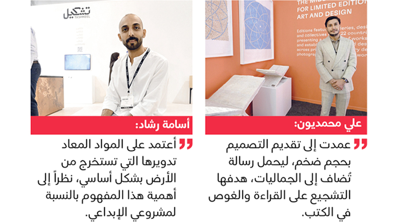 المصمم علي محمديون، قدّم تصميماً عبارة عن مسند للكتب، يجمع بين الحجارة والحديد. ولفت إلى أنه عمد إلى تقديم التصميم بحجم ضخم، ليحمل رسالة تُضاف إلى الجماليات التي يحملها الشكل، هدفها التشجيع على القراءة، والغوص في الكتب. وأشار إلى أن شكل المسند مستوحى من المساند التي توضع لقراءة القرآن الكريم، وهي مصممة من الحجر، وقد تعمد تقديمها كقطعة أثاث من أجل الاحتفاء بالكتب، لاسيما المهمة. وقال إنه في الأغلب يستلهم تصاميمه من الطبيعة، لهذا يغلب على المواد التي يستخدمها في أعماله ما هو مأخوذ من الطبيعة، ومنها المعدن والأحجار، مشدداً على أنه يجمع في ما بينها، وهذا ما يجعله يميل إلى الاستدامة في أعماله، فقد عمل في التصميم على اختيار الأحجار التي كانت عبارة عن بقايا، وقد تم جمعها بمنحها لمسة جمالية. ويشارك محمديون ضمن معرض «إديشينز للفنون والتصميم»، مبيناً أن كل تصميم هو عبارة عن قطعة من أصل خمس قطع.