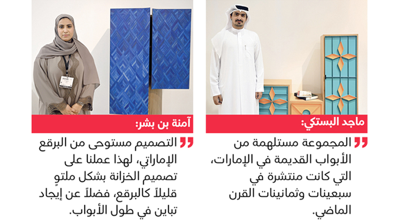 أمّا المصممة الإماراتية آمنة بن بشر، فقدمت إلى جانب دنى ودانيا العجلان، تصميماً لخزانة تحمل اسم «تليد»، وهو مصطلح يعني القديم والموروث. وأشارت إلى أن التصميم يحمل مفهوم الاستدامة، حيث تم العمل على الخوص واستخدام البقايا الخاصة به، وذلك بعد أن اكتشفت تقنية تتيح استخدامه في ترصيع الطاولات والخزائن بطريقة مميّزة. ولفتت بن بشر إلى أن التصميم مستوحى من البرقع الإماراتي، ولهذا عملت على تصميم الخزانة بشكل ملتوٍ قليلاً كالبرقع، فضلاً عن إيجاد تباين في طول الأبواب. وحول المواد التي صُممت منها الخزانة، أكدت بن بشر أنها مصنوعة من الخشب الطبيعي، والحديد، فضلاً عن المخمل داخل الأدراج. وأشارت إلى أن عملهن على التصميم يأتي وفق أدوار متباينة، موضحة أنهن ركزن على التراث، لأن التراث هو الحاضر والماضي، كما أن تقديم أفكار وتصاميم كهذه، يشجع الجيل الجديد على الاستلهام من التراث.
