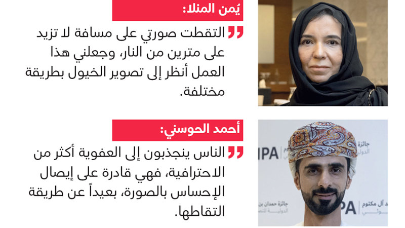 وأشار الفائز بالمركز الثالث في المحور العام الملوّن، أحمد عبدالله الحوسني، إلى أنه فاز بصورة لطفلة أنقذت في اللحظة الحاسمة من الخطر الذي كادت تتعرض له من الجَمَل، معتبراً أن الجائزة مهمة ويتنافس عليها المصوّرون من كل أنحاء العالم، وشدد على أنه بات أكثر بحثاً عن الموضوع في الصورة مع تقديمه بعفوية، لأن الناس ينجذبون إلى العفوية أكثر من الاحترافية، فالعفوية قادرة على إيصال الإحساس بالصورة، بعيداً عن طريقة التقاطها.