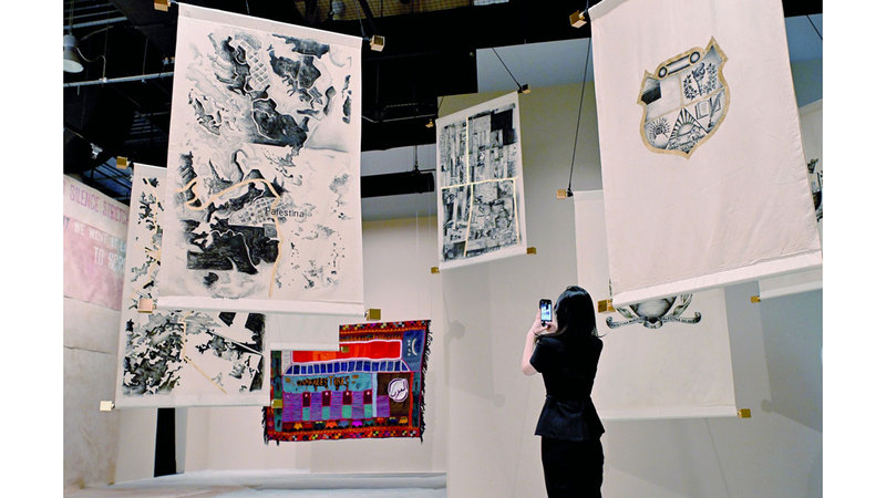 ومن الأعمال البارزة في المعرض، التي تستقبل الزوار في مدخله، عمل الفنانة الدكتورة نجاة مكي «إيقاع الأرض»، وهو نسيج سجاد يعتمد تصميمه على أشكال مثلثة بطريقة منظمة لتمثيل المخيم الفلسطيني في رمزية صموده، واستخدمت فيه الألوان الأبيض والأسود، والأخضر الذي يرمز لشجرة الزيتون التي اشتهرت بها فلسطين، كما تعرض مكي عملاً آخر يعكس التزام الإمارات بحماية البيئة من خلال الفن، عبر لوحة تمزج ألوان فسفورية للأزرق والأخضر والفوشيا، وتجمع خامات مختلفة مثل الحرير والصوف بتصميم مستوحى من الزجاج المعشق الذي تشتهر به الفنون الإسلامية، ويظهر بشكل دائرة تجسد الاستمرارية والكمال، مع تفاصيل نباتية وهندسية تجسد التنوّع الثقافي لأبوظبي، وتبرز القضية الفلسطينية وقضايا الشتات والاغتراب في أعمال فنية أخرى في فن أبوظبي هذا العام، منها معرض «ضفة أخرى»، ضمن قسم «البوابة»، الذي تشرف على تنظيمه كل من أوديسا وارين وكارين هارماند، ويركز على استكشاف الروابط التي تجمع بين العالم العربي وأميركا اللاتينية، عبر أعمال خمس فنانات معاصرات هنّ إميليا استرادا، وعلياء فريد، وفرانشيسكا خميس جياكومان، وعشتار ياسين جوتيريز، وماندي الصايغ.