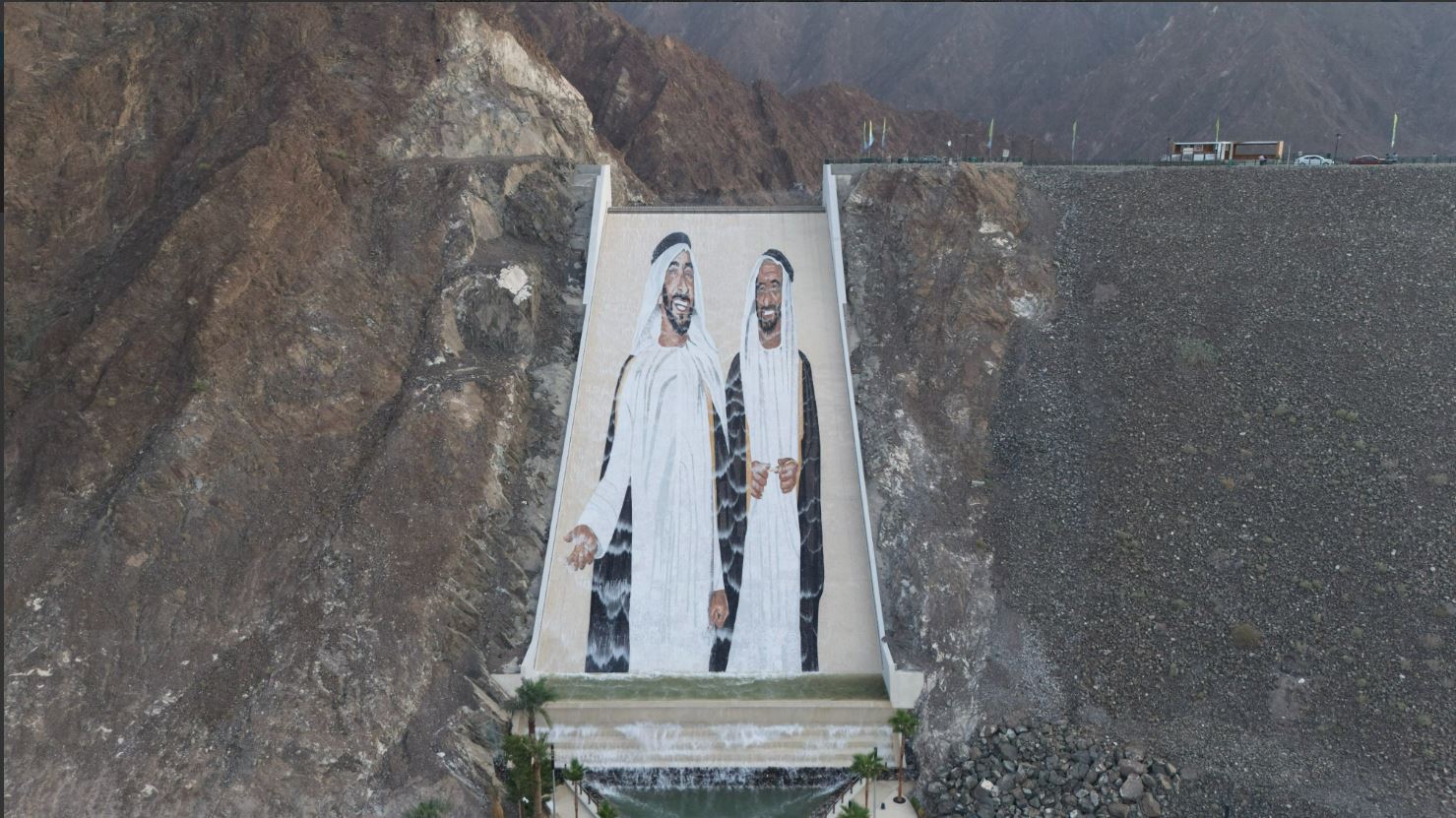 زايد وراشد في أكبر جدارية فسيفساء حديثة بالعالم على شلالات سد حتّا