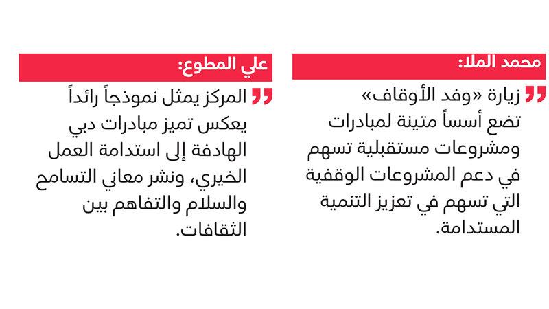 وقال: «تمثل زيارة وفد مؤسسة الأوقاف وإدارة أموال القصّر بدبي لمركز محمد بن راشد لطباعة المصحف الشريف، خطوة مهمة في مسار تعزيز التعاون والتكامل بين مؤسسات حكومة دبي، حيث تسهم الزيارة في تبادل الخبرات وبناء شراكات مثمرة تسهم في تحقيق أهدافنا المشتركة، الهادفة إلى خدمة المجتمع بأعلى مستويات الجودة والكفاءة»، مشيراً إلى «أن الزيارة تضع أسساً متينة لمبادرات ومشروعات مستقبلية تسهم في دعم المشروعات الوقفية التي تسهم في تعزيز التنمية المستدامة وتلبية احتياجات المجتمع، وتعزيز دور المركز في تقديم خدمة طباعة المصحف الشريف، وفقاً لأعلى معايير الجودة العالمية، وتحويل دبي إلى مركز عالمي لطباعة المصحف الشريف، ونشره حول العالم».