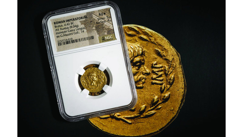 بيعت قطعة نقود ذهبية رومانية نادرة جداً تحمل صورة بروتوس، أحد المشاركين في قتل يوليوس قيصر، مقابل 2.09 مليون دولار ضمن مزاد، أول من أمس، في جنيف.