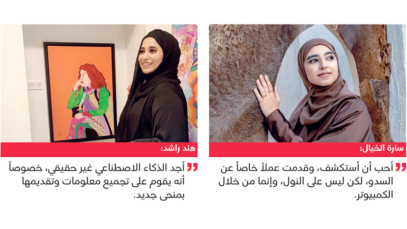 من جهتها، قالت الفنانة، سارة الخيال، التي تسعى لتقديم التراث الإماراتي بأدوات فنية معاصرة، عن أعمالها وأدواتها: «أحب أن أستكشف كثيراً قبل طرح أي عمل فني، وعلى الرغم من عملي على عناصر التراث المحلي، إلا أنني أبتعد عن التقيد بالمواد السائدة التي استخدمت كثيراً في الفن، فعلى سبيل المثال قدمت عملاً خاصاً عن السدو، ولكن ليس على النول الخشبي أو الحديدي، وإنما من خلال الكمبيوتر، فضلاً عن عمل الجمل الذي قدمت فيه مراحل البحث المتنوّعة التي قمت بها وبطبقات ووسائط مختلفة، بدءاً من جلد الجمل الحقيقي وصولاً إلى الأكريليك للعب بالإضاءة وتقديمه بشكل جديد»، وأكدت أنها تميل إلى التنويع بالمواد، وتستعين بالتكنولوجيا كثيراً، إذ ترسم جميع أعمالها على الكمبيوتر قبل البدء بتنفيذها، مبينة أنها لا تعتمد كثيراً على الذكاء الاصطناعي، خصوصاً أن نتائجه تعتمد على الأسئلة التي يطرحها عليه الإنسان، لذا تسعى إلى التعلم من كل مشروع جديد تقوم به. وأوضحت سارة أنها قدمت أعمالاً على طريقة «الأنيميشن»، من أجل إبراز الحرف التراثية، ولكن بشكل معاصر، فكانت الأقمشة تتبدل خلال الفيديو الذي يبرز للجمهور كيف تفكر المرأة التي تحيك السدو، منوهة بأنها متمسكة بتقديم التراث في الفن، وبأن تراث الإمارات يحمل الكثير من التنوّع، ومن واجبها طرحه من خلال الأعمال الفنية، كي توجد حالة من التواصل بين التراث والجمهور.
